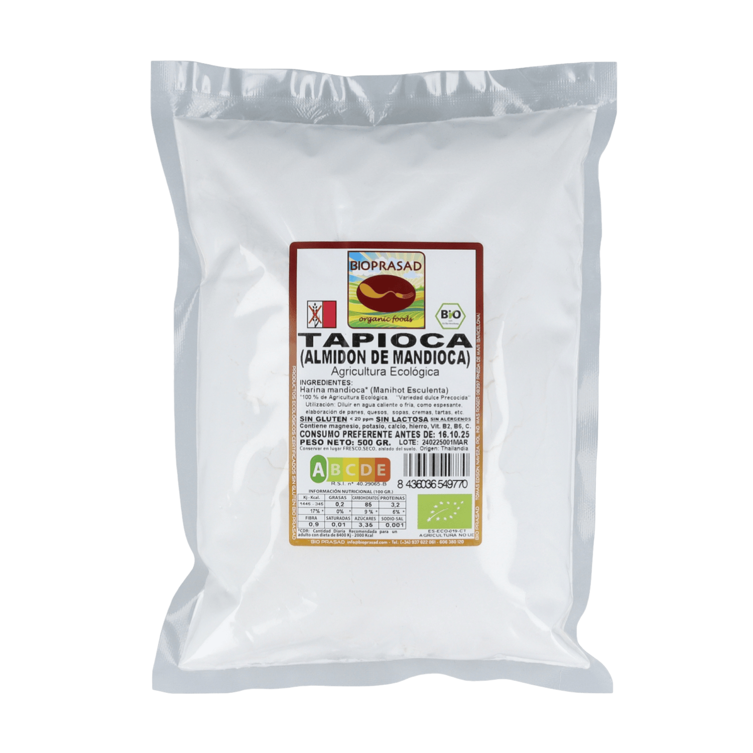La Tapioca (Almidón de mandioca) Bio de Bioprasad es un almidón natural y ecológico, obtenido de la raíz de la yuca o mandioca. Se presenta en forma de harina precocida, de textura suave y fina, ideal como espesante o como sustituto de harinas con gluten en panadería y repostería.
