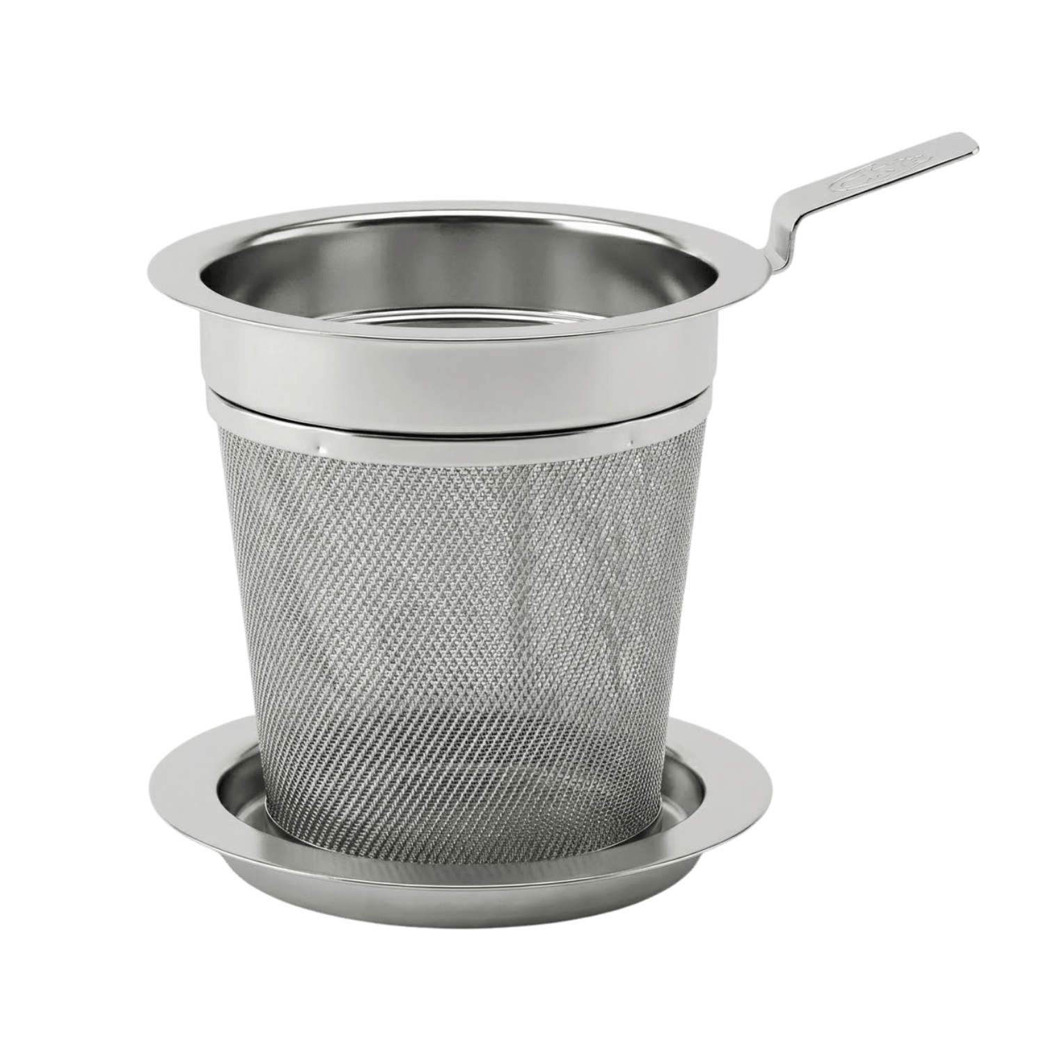 Filtro de acero inoxidable talla L, con malla fina, asa y plato incluido. Con sus 7 cm de diámetro, permite preparar té a granel de forma cómoda y limpia. Es resistente, fácil de lavar y perfecto para una infusión sin restos.