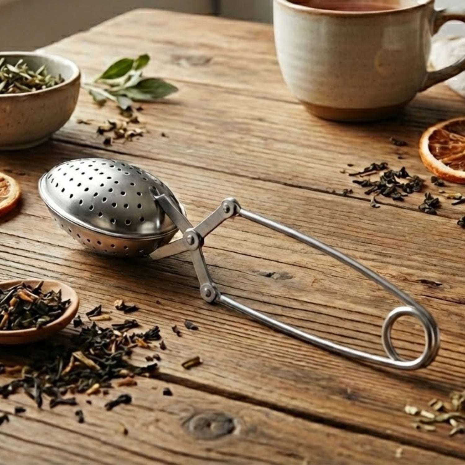 Filtro en forma de cuchara o almendra, hecho de acero inoxidable.Es perfecto para preparar té a granel de forma rápida y cómoda: solo se aprieta la pinza, se rellena con la cantidad de té deseada y se introduce en la taza. Práctico, resistente y muy fácil de usar en el día a día.