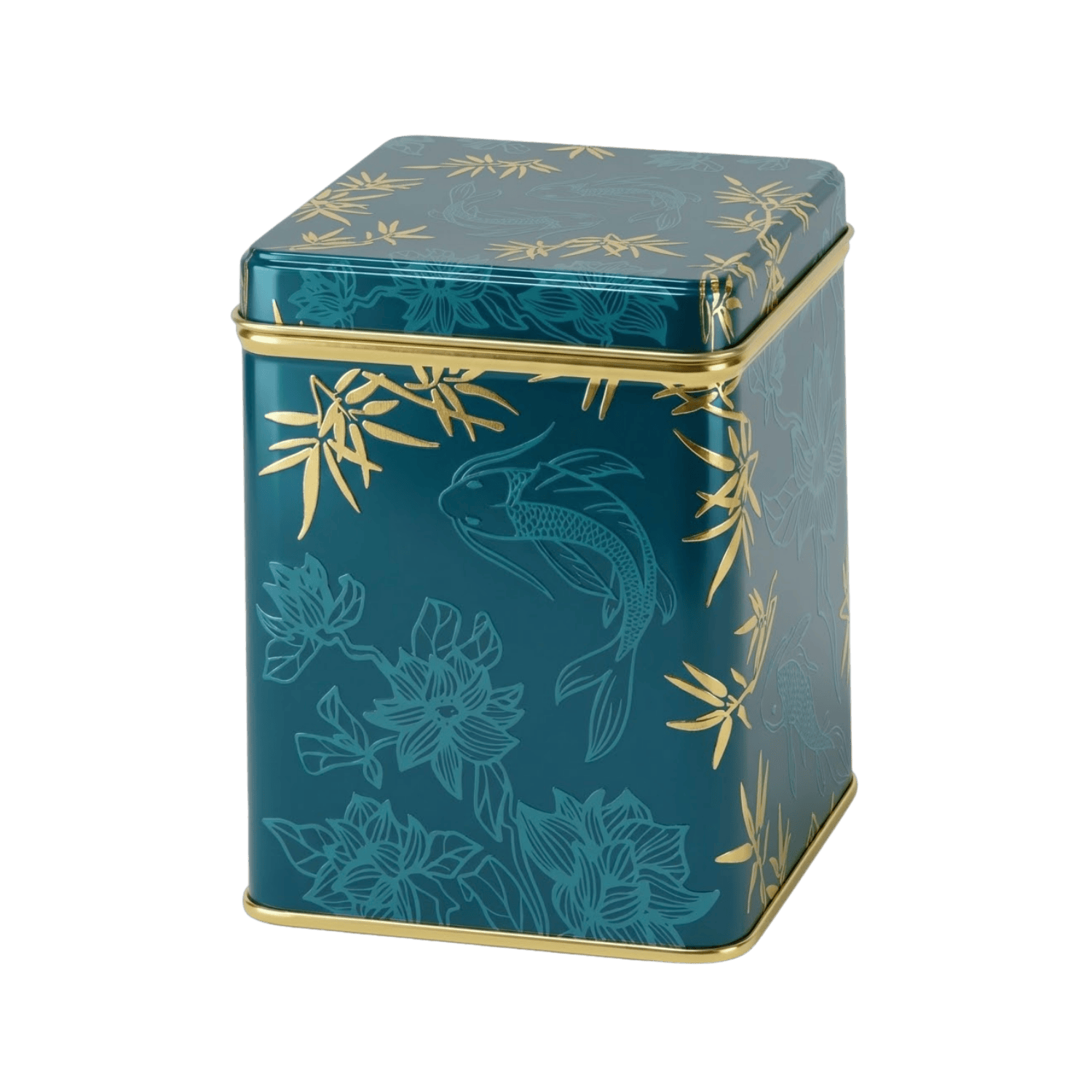 La lata Koi cuadrada de 125 gramos cuenta con una tapa gruesa a presión que mantiene el té fresco y aromático. Su diseño en azul profundo con flores y un koi dorado le da un toque elegante y decorativo.