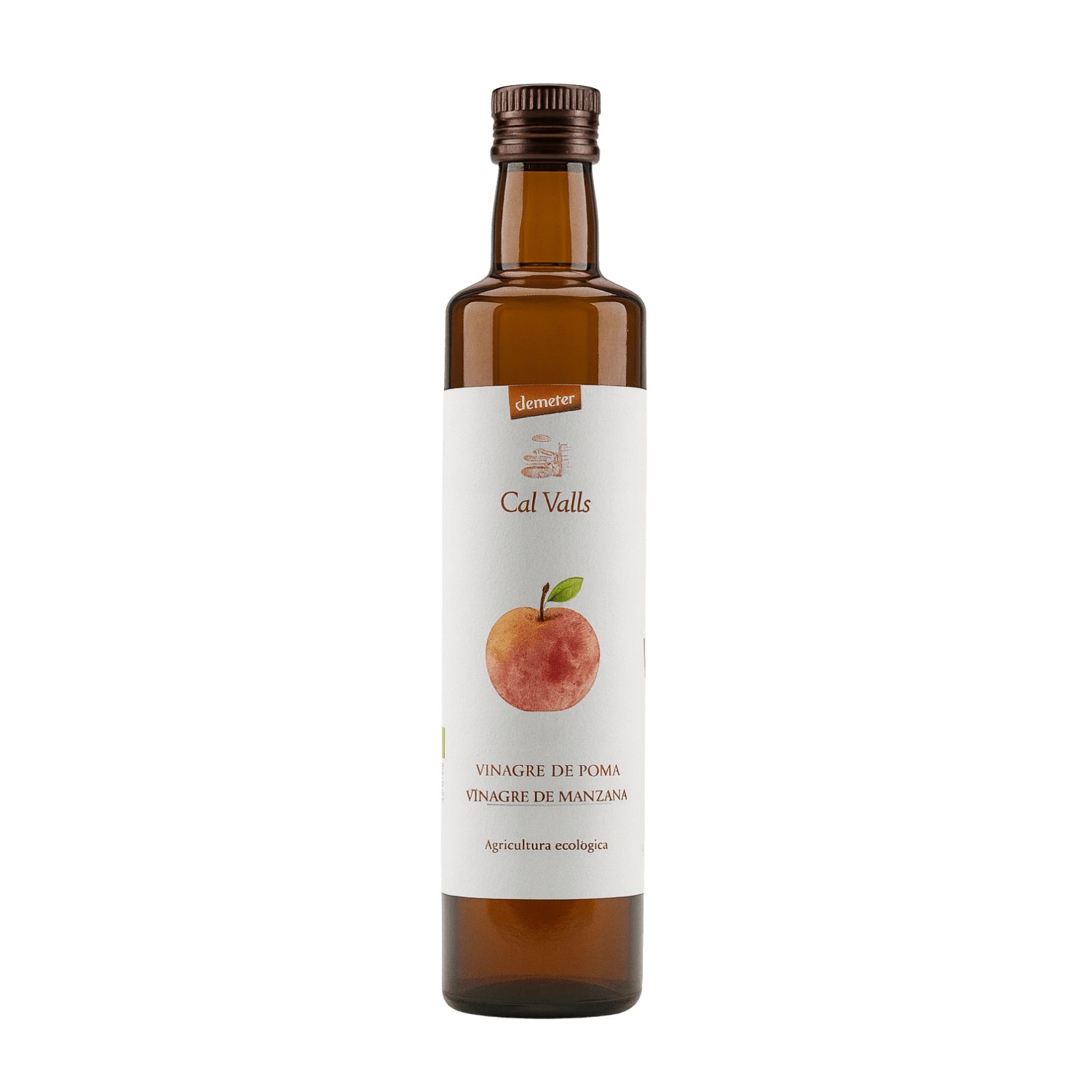 El Vinagre de Sidra de Manzana Eco/Demeter de Cal Valls es un vinagre artesanal, crudo, sin filtrar y sin pasteurizar. Se produce mediante la fermentación lenta y tradicional del zumo de manzanas frescas ecológicas de Lleida. Conserva la "madre del vinagre" —una sustancia turbia natural compuesta por bacterias y enzimas beneficiosas—, lo que garantiza todas sus propiedades naturales.