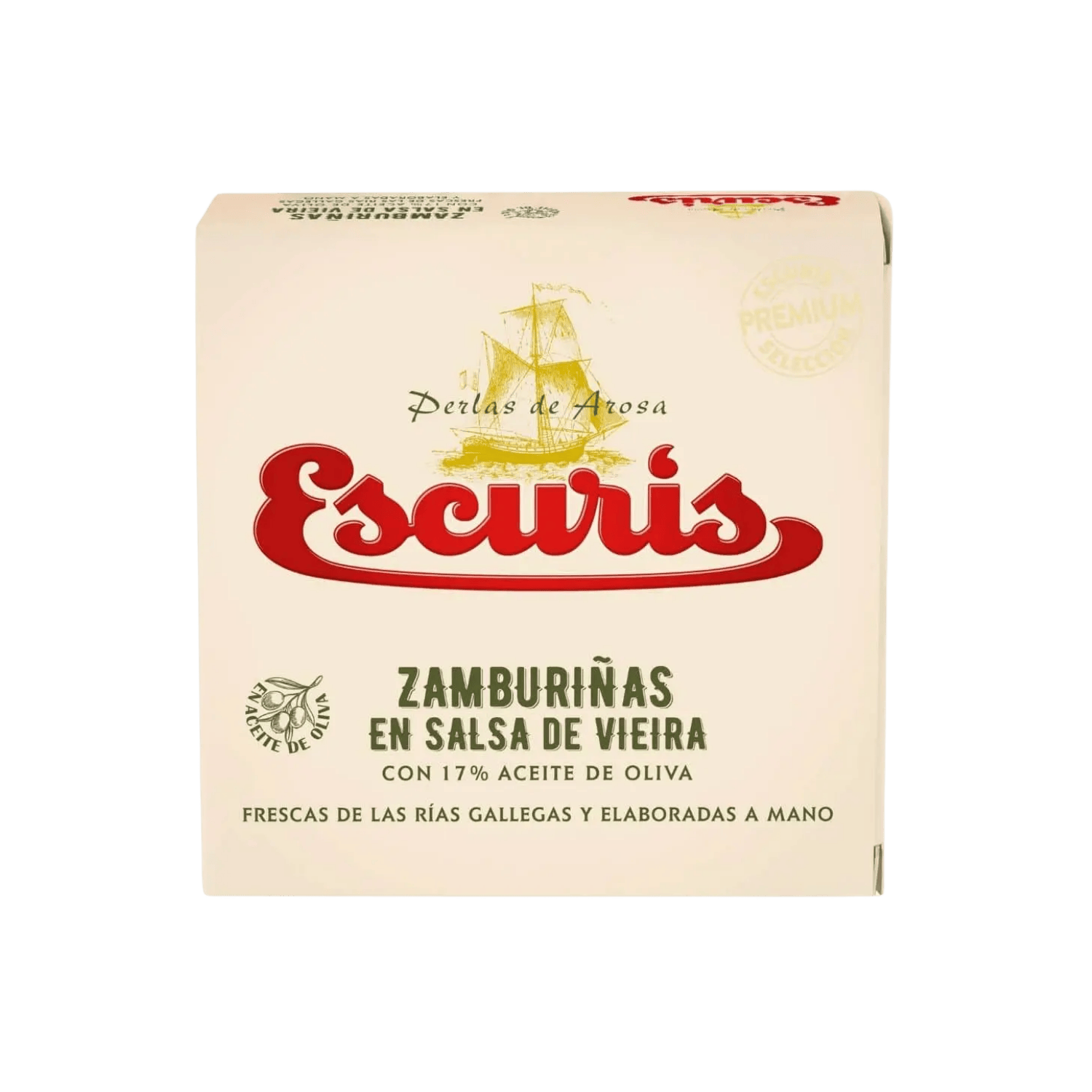 Las zamburiñas en salsa de vieira Escurís son un producto típico gallego, elaborado de forma artesanal a partir de materia prima de excelente calidad procedente de las Rías Gallegas. Las zamburiñas se depuran y se preparan en fresco, ofreciendo una textura tierna y un sabor delicado y exquisito. La salsa se elabora con ingredientes naturales como aceite de oliva, cebolla, tomate, pimiento y especias.